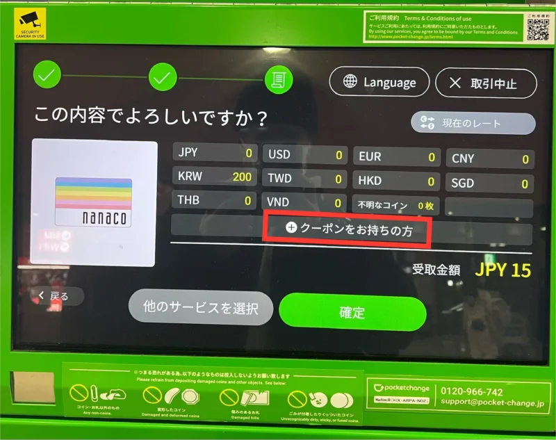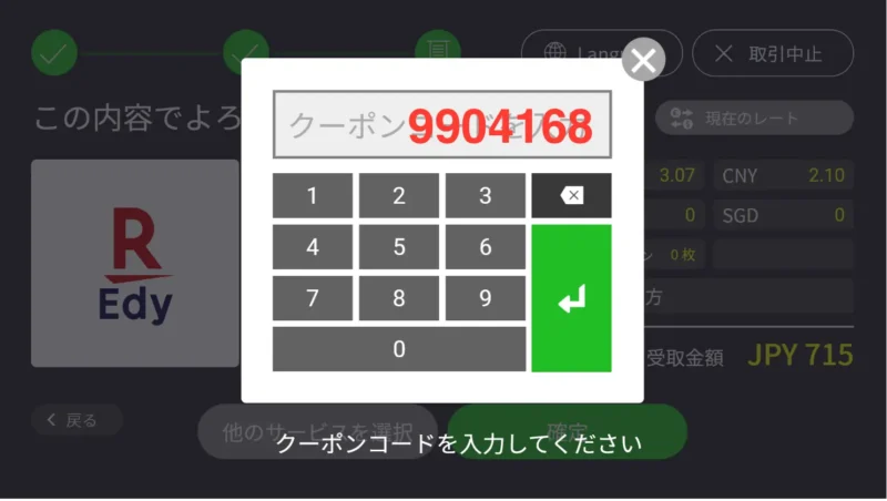 3. 「クーポンをお持ちの方」を押しクーポンコード「9904168」を入力する。日本円での受取金額が表示されるので「確定」を押す
